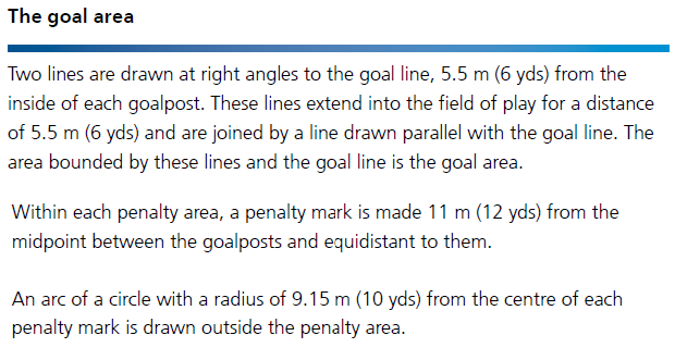 從距每個球門柱內側5.5米(6碼)處,畫兩條垂直于球門線的線。這些線伸向足球比賽場地內5.5米(6碼),與一條平行于球門線的線相連接。由這些線和球門線組成的區域范圍是球門區。