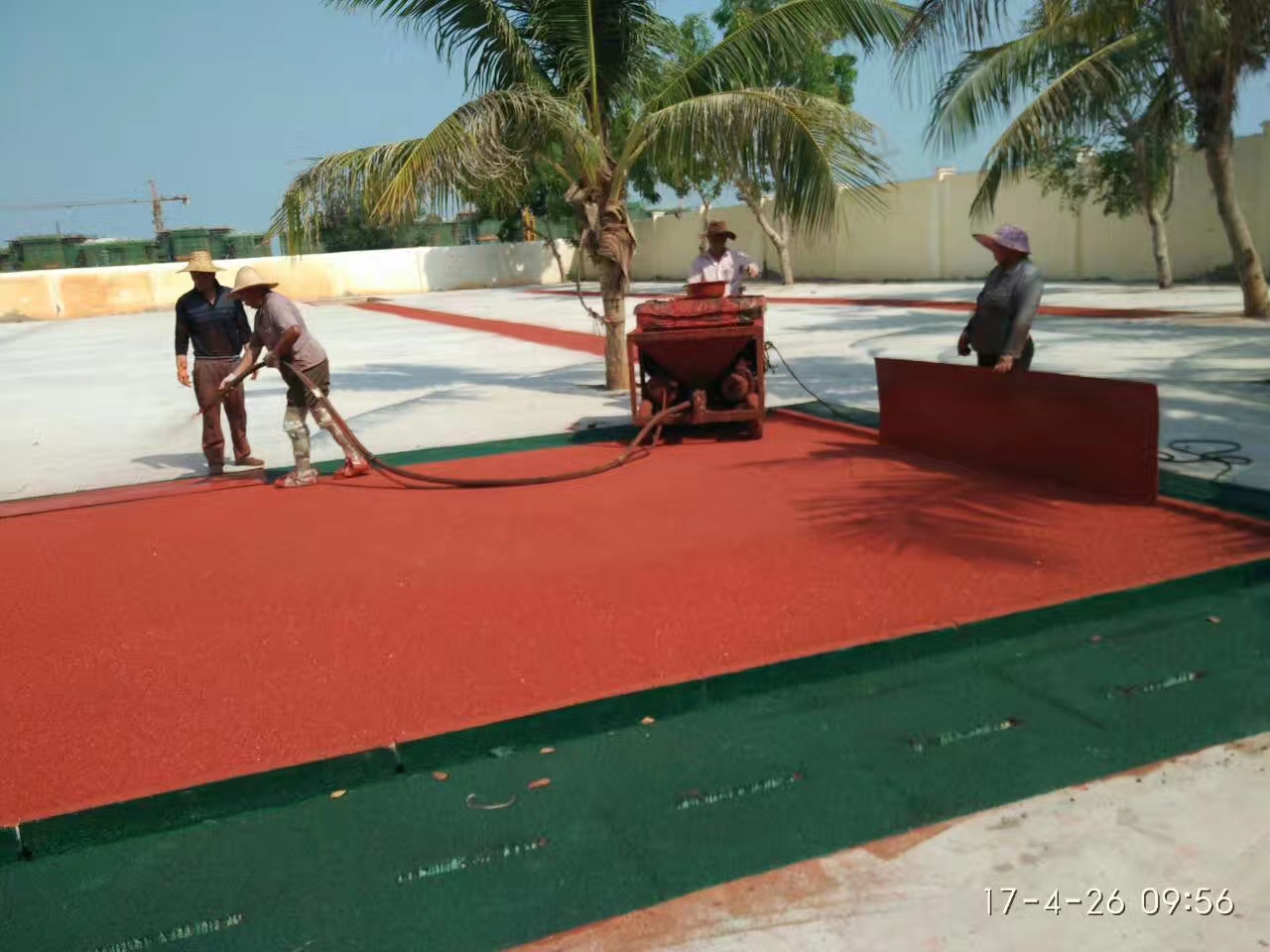 24小時后調查是否有不固現象以及粘接性、強度等功能是否到達要求!」で暗念A備工作(手藝)資料、東西設備(決定、磙子、皂水、車、耙、攪拌機等)、輔料及催化劑預備。施工人員要求(手藝)標場跑道施工人員最少不得少于八人:備料三人、運料兩名、攤鋪兩名、輔佐一名!∈┕ぃㄊ炙嚕簩⒘习捶蓊~混勻后,倒入場所內攤鋪,用加熱(噴燈加熱)或沾皂水后的決定拍實,拍平接縫,堅持全體平坦。場所厚度要求一般分兩次施工,以13mm為例:一般底層10mm橡膠顆粒和面層噴3mmEPDM或PU顆粒。